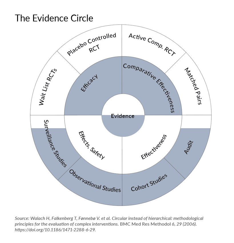 One alternative to the evidence hierarchy or pyramid, especially for complex interventions like massage, is what Harald Walach refers to as the evidence circle.
